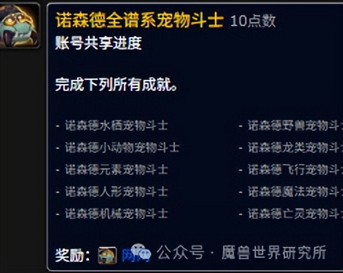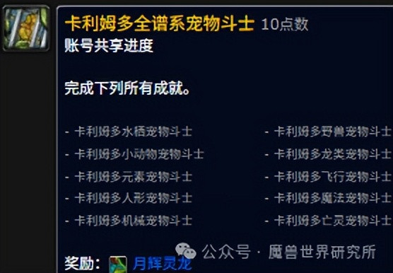该成就需要挑战遍布卡利姆多大陆的 12 位宠物训练师,仅限部落角色完成。完成成就的玩家,将获得一只精灵龙宠物作为奖励。
